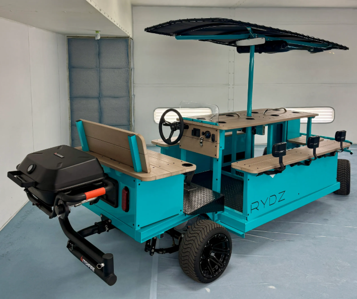 Enjoy the perfect group outing with the 8-passenger Rydz Social Cart! Whether you're celebrating a special event, family fun, or just a leisurely cruise, this stylish and spacious cart offers unmatched comfort, convenience, and entertainment. Its sleek design and easy maneuverability make city exploring a breeze. Reserve the Rydz Social Cart today and take your experience to new heights of fun and style!